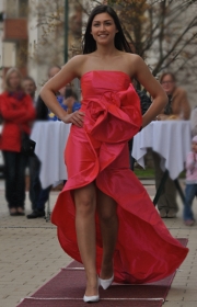 Abendkleid aus Taft mit interessanter Blüte im vorderteil Länge, vorne kurz, Rücken Schleppe angeschnitten | ||