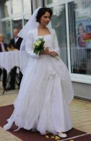 Brautkleid aus Seide, Rock mit Organzabänder zu Blüten drapiert | ||